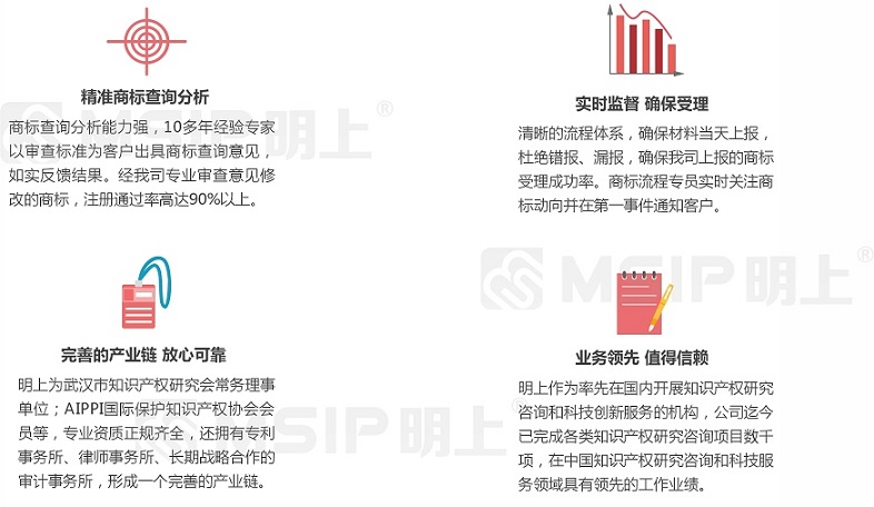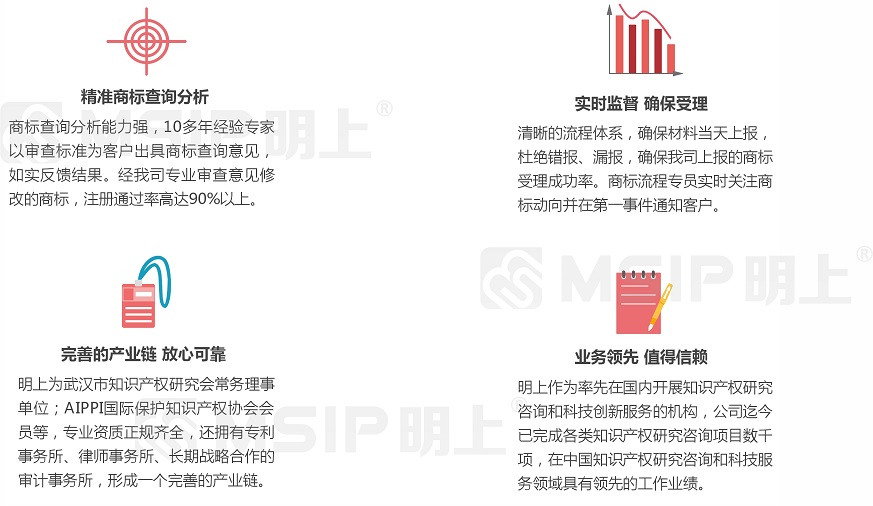 1、專業(yè)知識(shí)產(chǎn)權(quán)背景  明上利用自己專業(yè)化的知識(shí)產(chǎn)權(quán)背景,為企業(yè)知識(shí)產(chǎn)權(quán)領(lǐng)域業(yè)務(wù)提供專業(yè)解決、代理申報(bào)服務(wù)并完善申報(bào)工作中關(guān)于企業(yè)自主知識(shí)產(chǎn)權(quán)的專業(yè)問題。